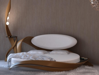 За да може едно необичайно легло да се впише идеално в интериора, то трябва да бъде заобиколено от същите красиви и течащи форми. Останалата част от обзавеждането (нощни шкафчета, пулове, маси и други мебели) трябва да има заоблена форма. Можете да допълвате дизайна на спалнята с овални огледала, кръгъл килим, вази, лампи и друг декор с елегантна форма. В главата на леглото може да се постави полукръгла арка с осветление.