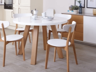 - Красив интериор в скандинавски стил може да бъде допълнен с кръгла маса в хладен или снежнобял нюанс. За да не изглежда ансамбълът с такива мебели твърде “студен”, той трябва да се разрежда с дървени кафяви столове и да се декорира в топли цветове (шоколад, бледо зелено, сметана).