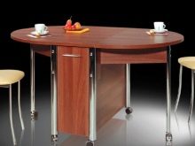- Идеален за стаи със скромна площ функционална сгъваема маса. Този модел не изисква много свободно пространство. В сгънато състояние тези мебели изглеждат много компактни и спретнати, но ако ги разгънете, ще видите просторен и удобен плот, зад който най -малко 5 души могат да седнат удобно.