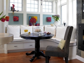 - За кухня с ниши отлично решение би било закупуването диван с еркери, което перфектно ще запълни празното пространство. Най -често тези дивани заемат място в прозореца на еркера, като в този случай те не трябва да са твърде високи, за да не блокират падащата дневна светлина. Дивани с еркери със спално място също имат вграден механизъм за изтегляне.