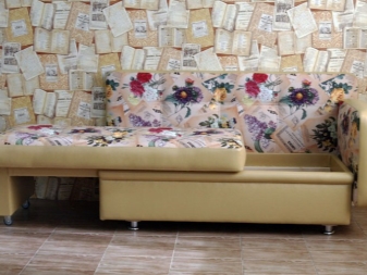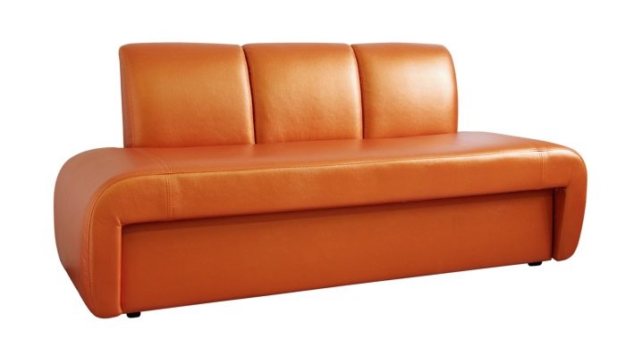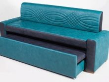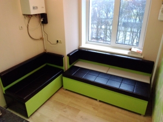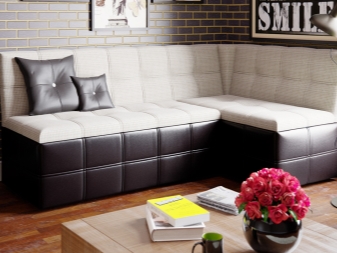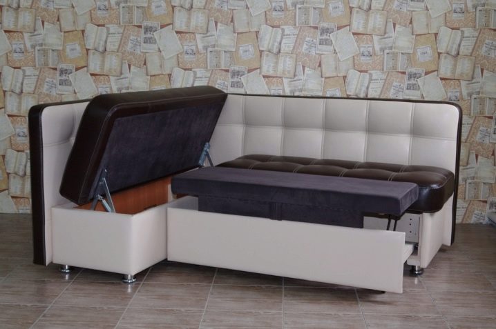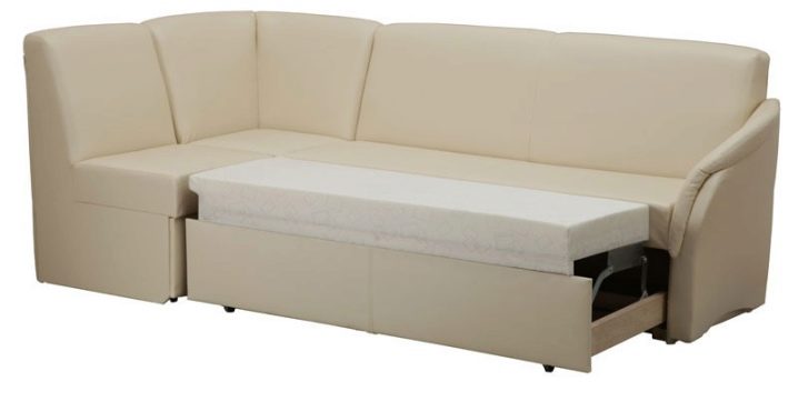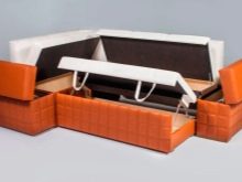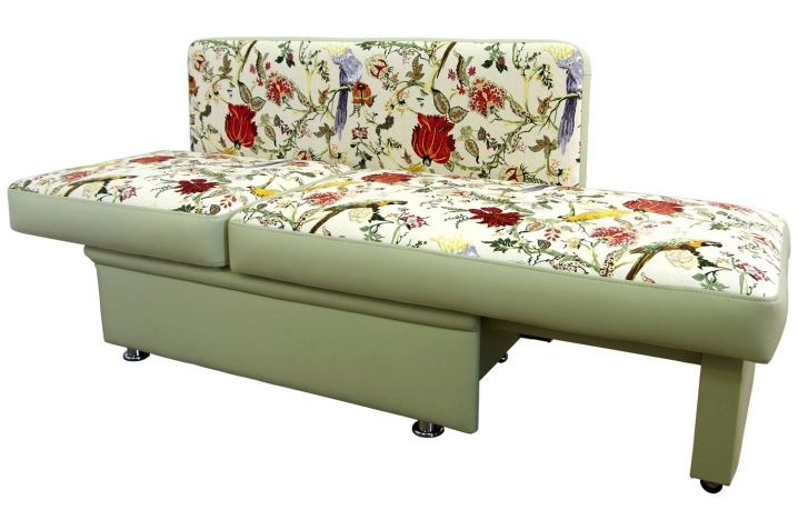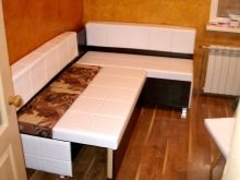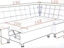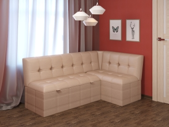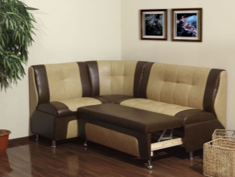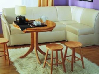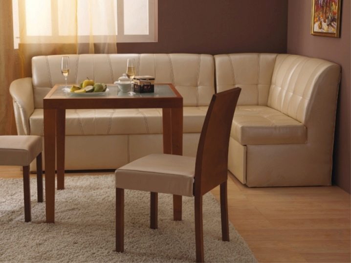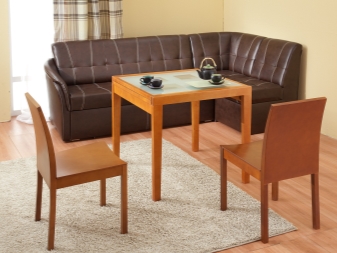 - Удобство. Седенето на мек диван е много по -приятно, отколкото на твърди табуретки без облегалка. И ако моделът се разгърне напред, тогава можете да си починете добре, докато ядете..