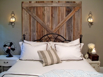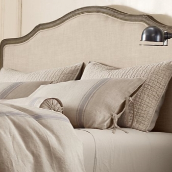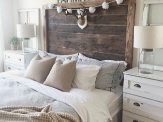 Главата на леглото е направена на базата на материала на рамката, може да бъде направена в мека версия с помощта на плат или кожена тапицерия. Когато избират такъв дизайн на табла, дизайнерите на мебели често използват метода на съединителя на каретата, за който използват естествена тъкан или кожа и избират като декорации големи мъниста, копчета, малки цветя от текстил или други естествени материали.