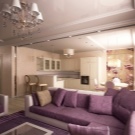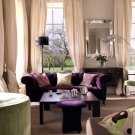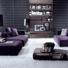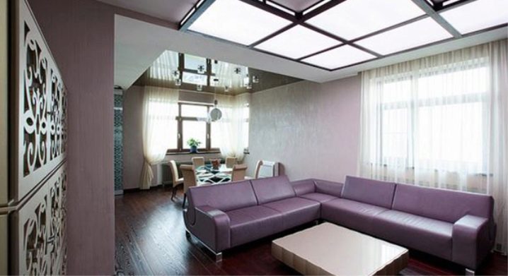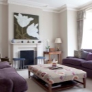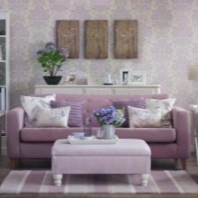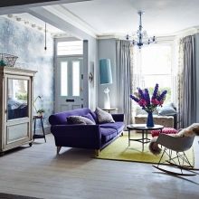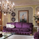 Погледнете по -отблизо лилавите дивани. Подобно решение ще придаде на вашата стая изисканост и ще я направи по -луксозна. Много добър вариант е комбинацията с бежов тапет и завеси в цвят лавандула. Когато създавате този дизайн, обърнете внимание на кадифената тапицерия..