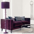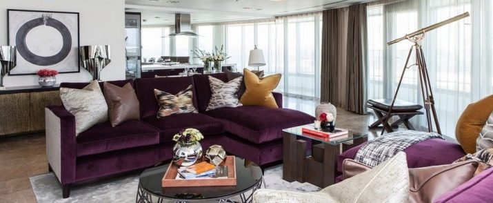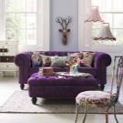 Тъмно лилаво диванът може да се използва като фон на композицията. Ако искате да получите „кукла“ и ярък интериор, започнете да „играете“ с контраст. Играта с розови и жълти предмети и люляк контраст ще ви помогне да постигнете това, което искате..