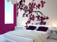 - С помощта на художествена живопис можете да добавите оригиналност и красота в стаята. Той върви добре със зелени листа и лилави цветя, поставени на бял фон..