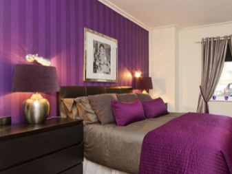 - Тъмно лилавите тапети, които се комбинират с мебели от тъмно дърво, ще изглеждат стилно. Добавянето на бяло легло с възглавници ще създаде специална атмосфера, която насърчава релаксацията.