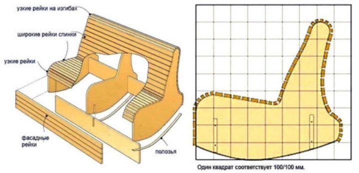 - Следващата стъпка е изработка на седалки. Формата на гърба може да бъде различна, но мнозина твърдят, че е по -добре да изберете класиката. На първо място се създава рамка, която трябва да повтаря формата на гърба. Те го правят от пръти, които са свързани помежду си с няколко напречни опори..