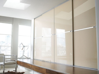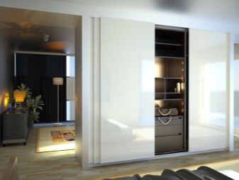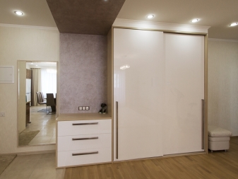 Гардероб с лъскава фасада може безопасно да се монтира в стилове таванско помещение, хай-тек, модерен, минимализъм. Горната опция за покритие е в перфектна хармония с различни естествени материали, като дърво или камък..