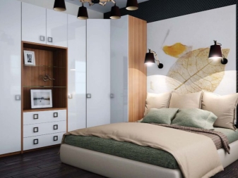 В съвременните стилове, особено що се отнася до високотехнологичните, артикулите с лъскаво покритие се използват активно. Заедно с мебелите, подовете в стаята са покрити с гладък и лъскав ламинат. Такъв дует е напълно приемлив и изглежда впечатляващ. За да подчертаят външния вид на мебелите, шкафовете са украсени със стъклени ъгли..