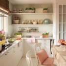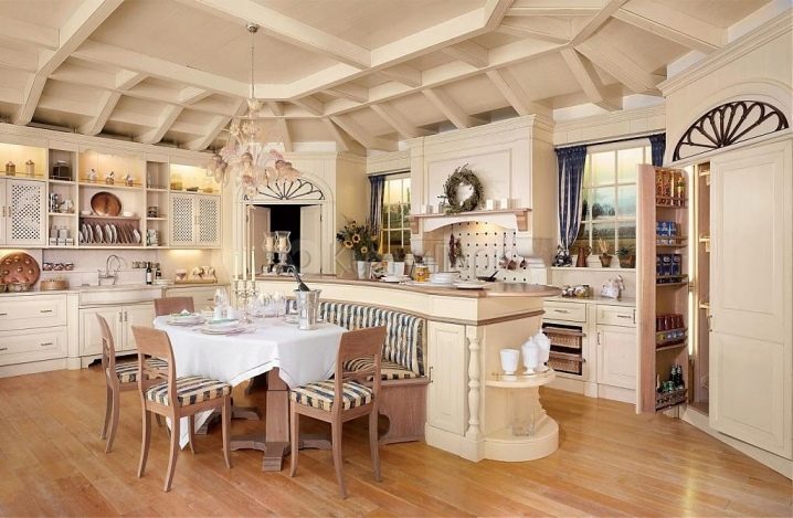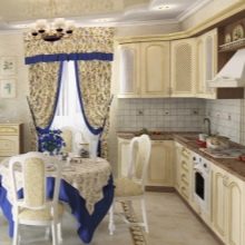 - Текстилни аксесоари. Покривки, салфетки, завеси, кухненски кърпи – всичко това трябва да бъде направено от естествени материи, за предпочитане памук или лен. Селските щампи като райета, чекове, цветя са добре дошли. Аксесоари с ръчна бродерия, подстригани с дантела или плитка ще добавят специален шик към вашия дом;