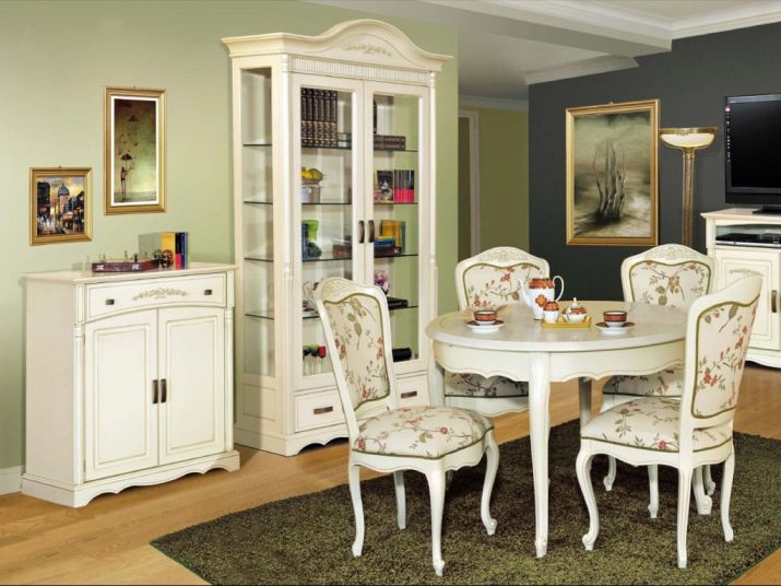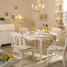 - Цветова гама. Този стил се характеризира само с най -деликатните пастелни нюанси. Маслиновите, небесните, охра, прасковените, розовите и белите цветове ще ви позволят лесно да ги комбинирате, защото те се съчетават добре помежду си. Също така няма да се налага да купувате мебелен комплект, можете просто да комбинирате няколко елемента с различни цветове, но сходни по стил и те ще изглеждат много хармонично.