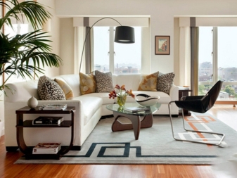 - В тази композиция масата е обект на декор, тъй като акцентът е поставен върху удобна зона за сядане – дивани;