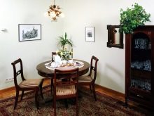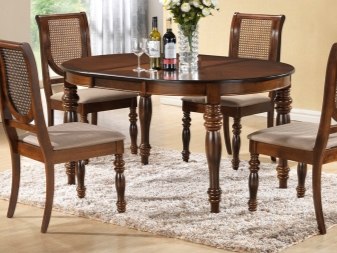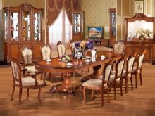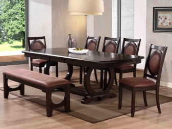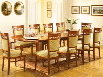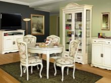 - Комплект със столове: използва се като единична система, състояща се от голяма маса за хранене и комплект от 6-8 стола за нея. Този набор от елементи традиционно се съдържа в класически модулен хол. Обикновено това са елитни марки, изработени от скъпи дървесни видове;