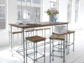 - Високи маси: Съвременните дневни често съчетават функцията на минибар. Дизайнът на такава стая изисква висока маса, която прилича на бар брояч. Височината на такива конструкции варира от 70 до 92 см, те са направени на дълги крака, а краката най -често са от хромиран метал, а плотът е от стъкло или камък – изкуствен или естествен. Високата маса е завършена с няколко бар стола, оборудвани с високи крака;