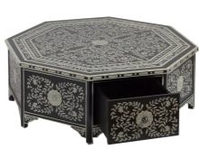 - Съществуват и опции за многоъгълна маса, като правило това са ниски малки маси в ориенталски стил. Те са инкрустирани със седеф, дърворезба, керамични вложки. Краката на конструкцията могат да бъдат издълбани или допълнени с чекмеджета.