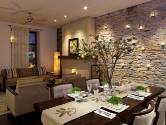 - Маса до стената: когато разделяте хола на зони, често място за маса е оборудвано по една от стените. Такова разположение спестява място в стаята и ви позволява да се фокусирате вътре в нея върху други еднакво важни детайли;