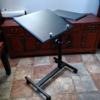 Тази версия на масата, както и предишната, има функциите за регулиране на ъгъла на плота и височината на масата. Все пак има място за мишката. Предимството на тези опции е, че те са напълно сгъваеми. Цената на такива модели е много по -висока..