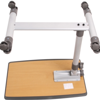 Най -простата версия на маса на колела е показана на снимката и се състои от плот за маса, опори и ролки. Този модел се нарича подвижен. Тази опция е удобна, тъй като може лесно да се навие до седалката. Подпорите тук са направени във формата на буквата С, а долната им част е разположена достатъчно близо до пода, благодарение на което може лесно да се постави под диван или легло. Размерът на този модел е 400x490x700 мм.