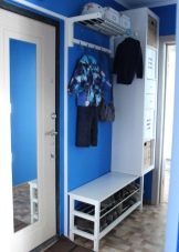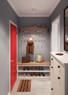 Ако нямате въпрос да поставите абсолютно целия гардероб в малък коридор, можете да направите с обикновена закачалка, която има няколко куки за връхни дрехи, рафт за шапки и шапки, както и малък скрин за обувки и ботуши, където можете да седнете и да смените обувките си.