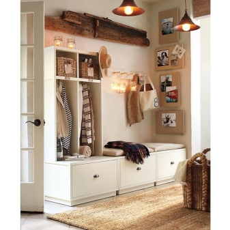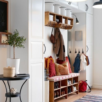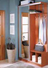 Понякога можете да се справите с една закачалка. Компактният и оригинален дизайн съдържа всичко необходимо: имаше място за дрехи и обувки, ръкавици и чанта. Тук можете да седнете и да смените обувките си и да видите отражението си в пълен растеж в огледалото..