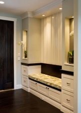 Лаконичният дизайн на тесен коридор се основава на използването само на долни чекмеджета за настаняване на голям брой различни предмети, за да не се претоварват стените. Тази техника, както и белият цвят, правят стаята визуално по -широка. Над чекмеджетата удобна седалка добавя комфорт на малко пространство..