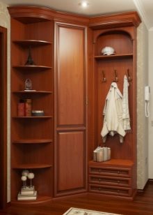 Полукръгла стена успешно ще се впише в миниатюрен коридор. Шкафът на този модел обикновено има заоблени рафтове, където можете да поставите ключове, ръкавици или други дребни неща. Особено заслужава да се отбележи опцията за коридор за семейство с деца. Ако в къщата има малко дете, куките за дрехите на бебето ще бъдат разположени най -отдолу. Когато бебето порасне, ще бъде възможно да поставите чадър или чанта върху тях.