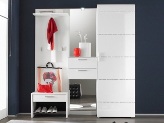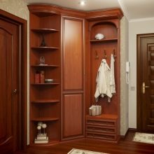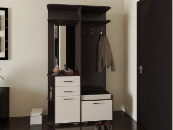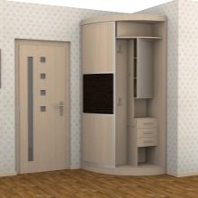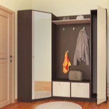 Малка мебелна стена, монтирана в ъгъла, е изключително удобна и може да побере много предмети. Тя ви позволява да използвате дори тези квадратни сантиметри, които са трудни за използване с обикновени мебели. По правило такъв комплект включва шкаф, който заема ъглово пространство. От едната страна има отворен модел закачалка, оборудван с куки за дрехи и специален рафт за шапки и шапки, от другата има шкаф за обувки, може би има и скрин и огледало.