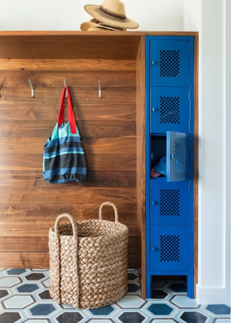 Миниатюрно и предизвикателно стилно антре с яркосин тесен гардероб с чекмеджета, закачалка от естествено дърво. Удобно е да закачите палто върху него и отгоре да сложите шапка. А също и като арт обект – кош за обувки.