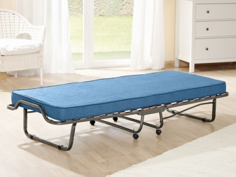 - Друг чест посетител в обикновените къщи е сгъваемата желязна конструкция, просто казано, детско креватче. Те могат да бъдат единични или двойни. Такова сгъваемо легло може да помогне при всяка непредвидена ситуация, независимо дали става дума за повреда на леглото ви в спалнята или пристигането на роднини. Сгъваемите модели обикновено се изработват с решетка в основата, което ги превръща в скърцащ и не особено удобен вариант..
