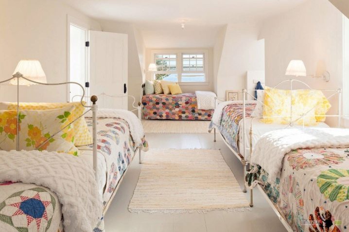 Примерът показва интериор, в който присъстват няколко модела желязо едновременно.. Такава детска стая е подходяща както за момчета, така и за момичета.. Отново светлият цвят на леглата ви позволява визуално да създадете илюзията за разширено пространство. Железните легла в много отношения помагат да се справят с липсата на място, тъй като визуално не изглеждат толкова обемисти като дървените..