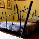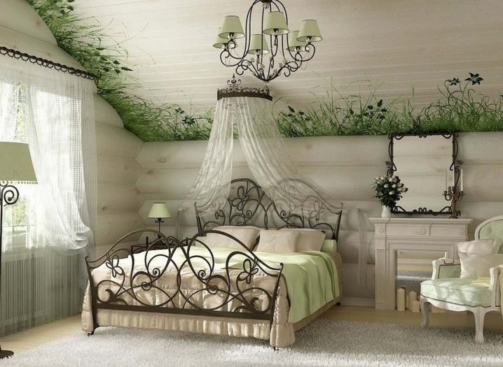 Художественото коване изглежда много интересно при декориране на легла с балдахин. Например, в този конкретен случай, декорът на леглото отразява основната идея на еко-интериора, като същевременно служи като основен акцент в стаята..