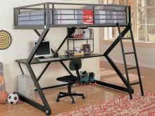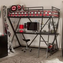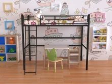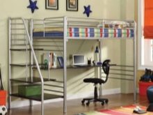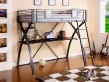- Метални тавански легла, комбинирани с работна зона. Много удобен вариант и идеален начин да спестите място в малка стая. На долния етаж има удобно бюро с рафтове, което ще се превърне в удобно работно място за възрастни, докато децата на масата могат да учат и да си вършат домашните. А на второто ниво има удобно място за спане.
