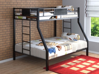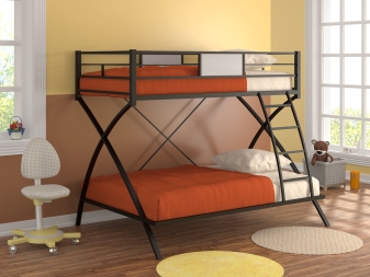 - Двуетажни метални тавански легла – един от най -популярните и най -често срещаните варианти. Те могат да бъдат направени под формата на две единични легла, или може да има двойно легло отдолу и едно единично легло отгоре. Нивата на леглото могат да бъдат подредени в една линия или под различни ъгли.
