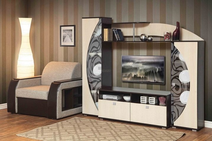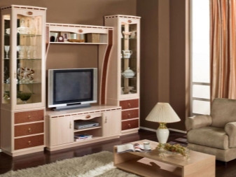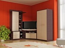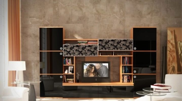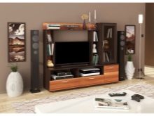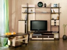 - Най-често срещаната е мини-стената. под телевизора. Оборудван е със специална ниша за телевизор, аудио системи и рафтове за съхранение на дребни предмети. Освен това тези рафтове заемат по -голямата част от пързалката..