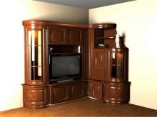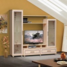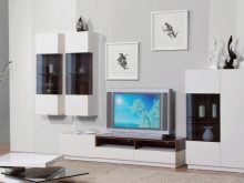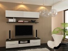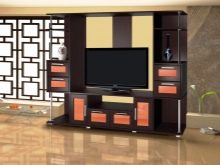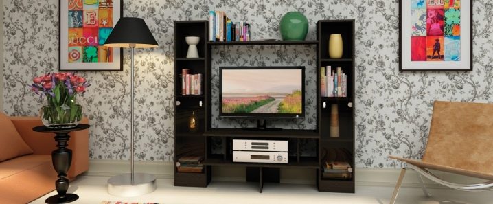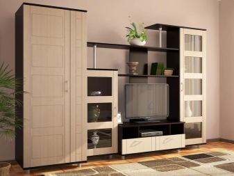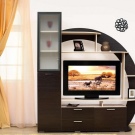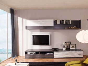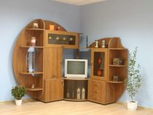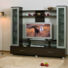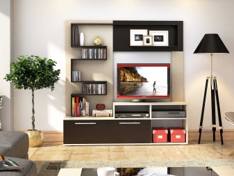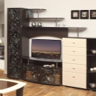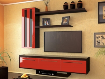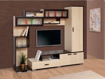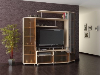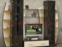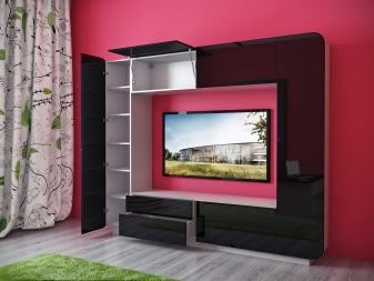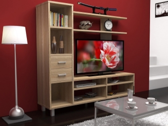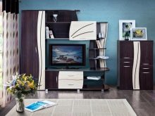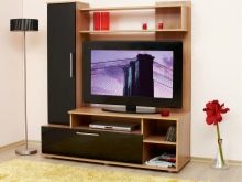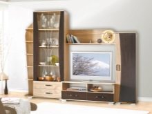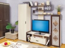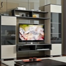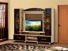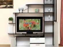 - Най-често срещаната е мини-стената. под телевизора. Оборудван е със специална ниша за телевизор, аудио системи и рафтове за съхранение на дребни предмети. Освен това тези рафтове заемат по -голямата част от пързалката..