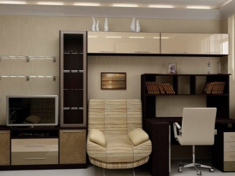 - Някои модели малки стени се произвеждат без ниша за телевизор и са оборудвани с бюро за компютър. По този начин в хола можете да създадете работна зона, в която ще бъде удобно да работите на компютър..