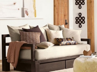 Този модел е много стилен и универсален, може да се постави навсякъде в стаята. Огромното предимство на този дизайн е, че скрива голяма кутия за неща. Можете да поставите всичко в него: обувки, дрехи, спално бельо и много други. Този диван може да бъде оборудван със стойка или колела. Освен това рамката обикновено е изработена от висококачествен дървен материал..
