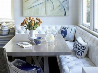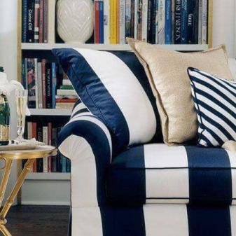 - Морски стил предполага наличието на комбинация от бели и сини тонове, щампа под формата на ивици. Също така, някои дивани в морски стил са украсени с червени шарки, които изглеждат страхотно на бял и син фон..