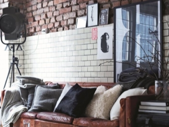 - Модерни дневни в стил таванско помещение украсете с дивани, направени в същата посока. Такива мебели са прости, тапицерията им обикновено е бордо, кафяво, черно. Цветът на тухлите на такива мека мебел също е много популярен, тъй като много често при създаването на дизайн в този стил интериорът се разрежда с една или повече стени с имитация на тухли..