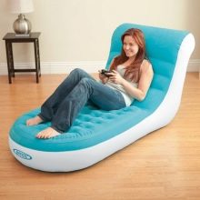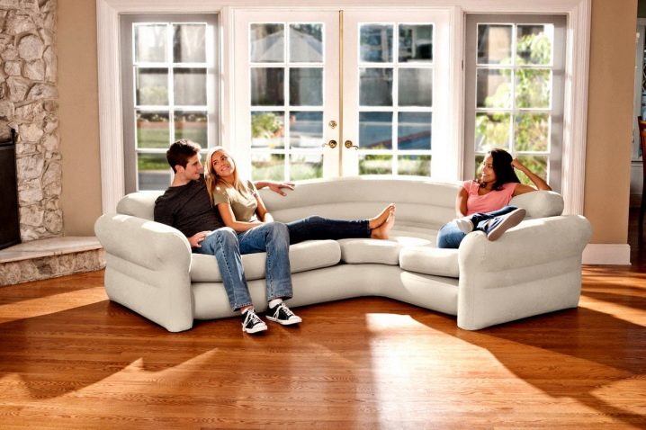 Търговско дружество Intex също е специализирана в надуваеми мебели – предлага дивани, фотьойли, матраци, легла. Много интересен вариант с ъглов надуваем диван. Отдалече прилича на обикновен бежов диван, покрит с кожа. Състои се от няколко блока, има облегалка и подлакътници. Ширината му е двеста и шестдесет сантиметра, височината му е осемдесет и струва около седем хиляди рубли.