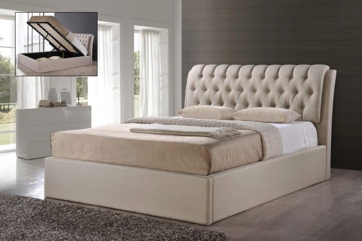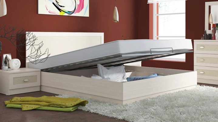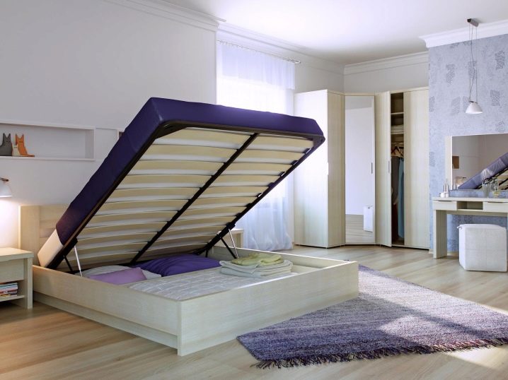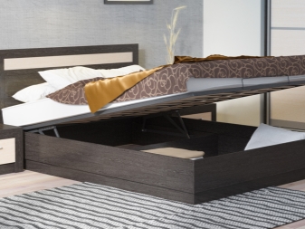 Повдигащите се легла не само не заемат много място, но и обратно, ви дават допълнително място за съхранение на предмети, които не е необходимо да използвате всеки ден.. Това става с помощта на просторна ниша, която понякога има параметрите на самото място за спане. До него можете да получите достъп чрез повдигане на матрака и решетката. Самата кутия за съхранение е скрита от любопитни очи от долната рамка на леглото, но въпреки привидно напълно затвореното пространство, мястото е добре вентилирано благодарение на решетка от дървени ламели.