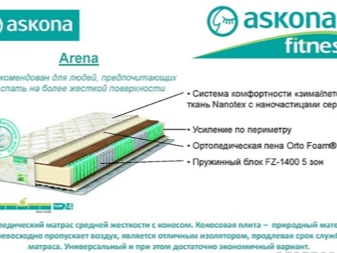 За любителите на активен начин на живот, колекцията е подходяща! Аскона Фитнес “. Матракът е разделен на 5 зони с различна твърдост. Основният модел е комбиниран, включва филцови влакна и ортопедична пяна. Други модели използват кокос и латекс. Има матраци с еквивалентна двустранна употреба. Страните имат слой от латекс и слой от кокосови влакна, някои са допълнени с масажен ефект. Най -често те са със средна твърдост. Размер – 200 х 160. Оборудван с калъфи от плат NANOtex, съдържащи сребърни наночастици.