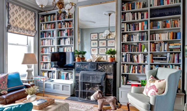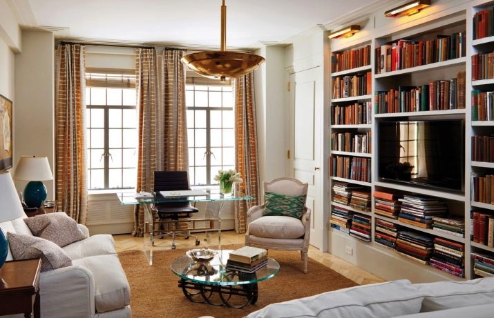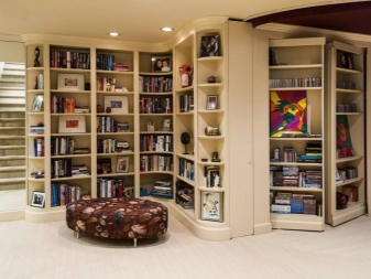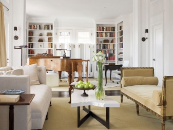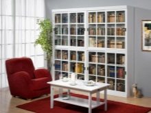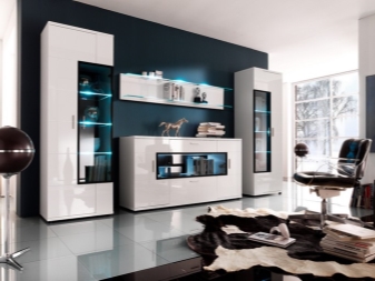 Отворените шкафове с рафтове са алтернатива на рафтовете за книги за читални, дневни. Такива шкафове обикновено заемат цялата масивна стена на помещението. Когато декорирате интериора, ще бъде правилно да изберете бяло, тъй като светлите цветове визуално улесняват възприемането на мащабни структури.