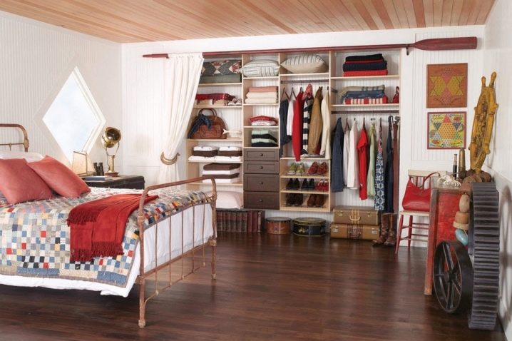 Препоръчително е да инсталирате полуотворен гардероб в спалнята. От една страна, има затворена секция за съхранение на неща, които не се използват много често, а от друга, отворена част, която служи като допълнително място за съхранение на ежедневни дрехи, малки аксесоари, декоративни елементи.