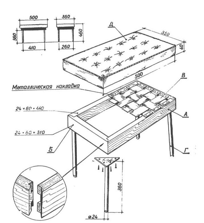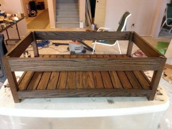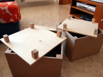 Производството на части и тяхното сглобяване трябва да се извършва на етапи, защото събирането на всичко е много сериозна работа. За да избегнете грешки и да не разваляте мебел, трябва да се придържате към някои правила. Например, отвори за винтове трябва да бъдат направени в шперплат. За това се използва бормашина. Капакът трябва да е със същия размер като периметъра на кутията, за да не пречи на облицовката на продукта по -късно. Сглобяването на рамката започва с факта, че квадрат се сглобява от заготовки на работна маса и се свързва със самонарезни винтове. Предварително изрязаното дъно се закрепва с самонарезни винтове към рамката, след което конструкцията се боядисва отвътре с петно.