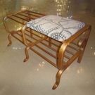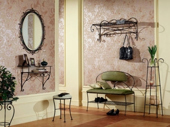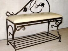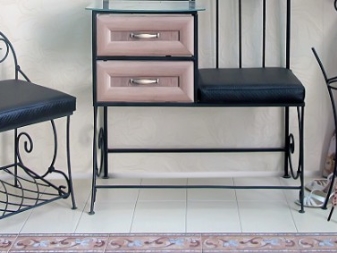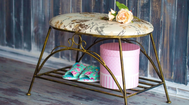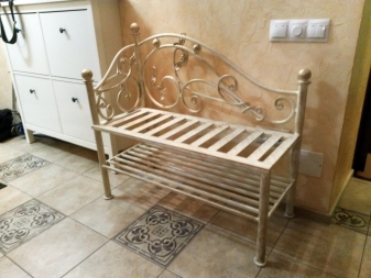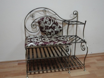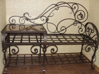 Тази опция е подходяща за тези, които искат да украсят стаята си по оригинален и стилен начин. Характеризира се с метални конструкции, усукани крака, облегалка, подлакътник. Често такива продукти са покрити с плат. Обикновено в такива модели има рафтове за обувки – например под формата на решетка. Това ви дава специално място за съхранение на вашите обувки..