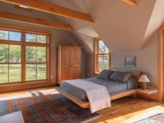 Скромни завеси, дъсчен под с тънки ръчно изработени килими, трофейна животинска глава (или нейната имитация) на стената – всичко това ще създаде правилното настроение. По -добре е да откажете нощни шкафчета. Ако имате нужда от място за съхранение на малки предмети, по -добре е да окачите малък дървен рафт на стената..