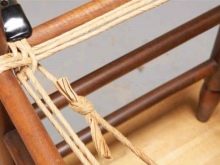 - Тъкане. За това конци или лозя са прикрепени по целия периметър на рамката на определено разстояние един от друг. Ако се използва ратан, той просто се преплита с основата. След като завършат първия слой, те започват да създават втория. Това включва преплитане на предварително фиксирани нишки с нови елементи. Най -простият вариант се счита за шахматно редуване на хоризонтални и вертикални линии. Но има и други техники на тъкане. След това всички структурни елементи на мебелите от гърба до краката се преплитат по подобен начин..