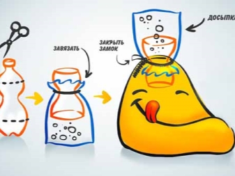 Напълнете торбата с топчета от пяна с помощта на пластмасова бутилка: първо отрежете гърлото и дъното й, за да образувате тръба. Отворете ципа и поставете тръбата така, че едната половина да е в торбата, а другата половина да е навън. Закопчайте ципа и фиксирайте тръбата, започнете да наливате пълнител до 2/3 от обема на торбата (ако добавите твърде много гранули, столът няма да се „прегърне“).