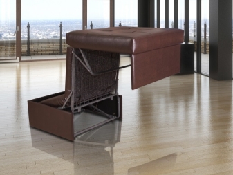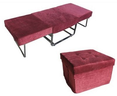 - Сгъваем пуф Едно от най -удобните решения. По правило този продукт е правоъгълник със сгъната метална конструкция с мида вътре. След отваряне на капака тази структура се изважда и се разгъва. Моля, обърнете внимание, че при закупуването на такива мебели е препоръчително да закупите допълнителен матрак.